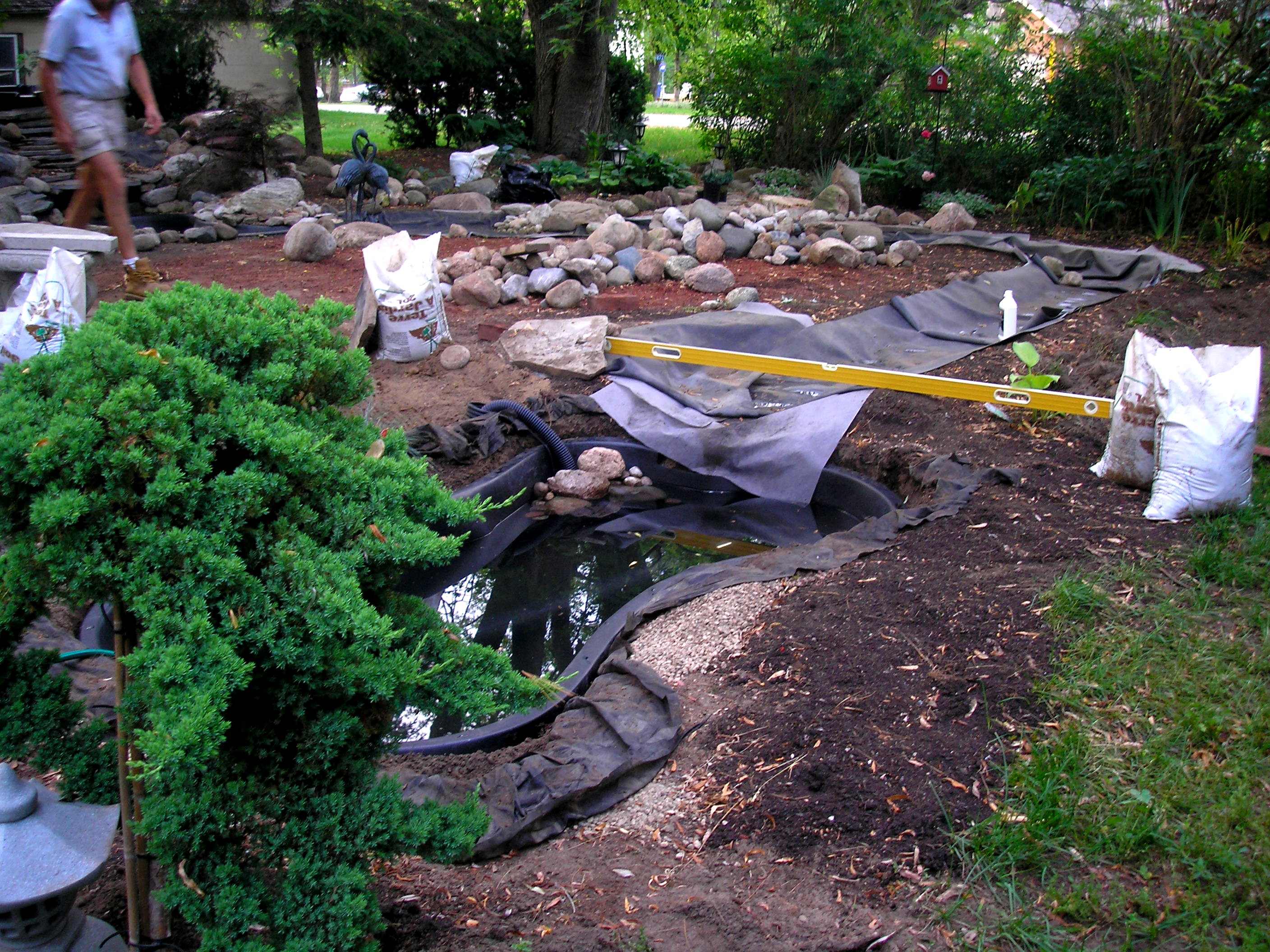 How to design and build a Waterfall and/or Garden Planning is everything when it comes to building your waterfall and/or garden. Do you think the sun just happened to set in the perfect spot of this waterfall feature? Or do you think the sunrise just happened to rise and reflect over the lower waterfall in this double waterfall, double pond and over 35' creak. No. I stood and looked at things over and over. I spent a lot of time looking at things at the end of the day noting where the sun set and where the sun rises. There is seating in the right location so that these views exist. PLAN and when you are done, check your plans again. So you would like to have your own waterfall and/or a beautiful garden. They don't just happen and the best usually come with a lot of trial and error and years of transformation. There are many tricks and methods that can be used by proper planning. PLANNING Now that you have decided to actually build a waterfall or garden there are a few things you should do. Make certain you have shopped around and know your cost. Although the finished result has rocks, stones, mulch, plants, and a few other things make sure you have set aside enough money for the job. You should take some time to view photos online of some of the thousands of waterfalls. View both those that are natural as well as some that are man made. Once you have picked out a dozen or so of your favorite photos take time to study them. With each of these photos pick out EXACTLY what it is you enjoy about the photos. Remember to eliminate the parts of the photo that will not be in yours. E.g. if there are lots of trees in the photo you like try eliminating them. Print the photo and cut the part that you like out so that the nature that is in the photo is not seen; or you can do it in a computer program if you have the skills. Once you have cut out all the pieces of each of these photos you can now effectively begin to design your yard. Take a photo of the area of your yard that you are wanting to designate as your waterfall and/or garden. Manipulate the cut-outs of your favorite photos until you have a design that you are happy with. You can always change your waterfall and/or garden easily on paper or in the computer. Many waterfalls are not built properly and therefore the end result is wasted money, wasted time and an unused enormous amount of work. And they do take a lot of work. Remember as well that a waterfall uses water and electricity. These are both operating expenses that many people don't consider. To design the perfect waterfall and/or garden use these tricks. Take a chair and sit in your yard. Notice where the sun rises and where it sets. If the sun doesn't set for you in the right location remember there are many artificial light sources that can be used to make yours look spectacular. Next thing is to take your plans, a chair, and a bunch of tarps or blankets and towels to your new area. You are planning to build into your personal retreat so take time at this point to play with the layout as per your plans. Lay the tarps or blankets and towels into the planned area. Push or pull them into the desired shape that pleases yourself. You have to use some imagination as you are doing this. The tarps or blankets and towels represent the areas that will be filled with water as well as the natural shoreline. The areas that are left are important as you will need to be able to walk around to service your waterfall and/or garden. Also there should be enough space for seating, paths or walkways, etc. As you can see a magnificent waterfall/garden do require space planning for yourself as well as for plant growth. Stake the ground or spray paint the areas selected for specific uses as per your plans. BREAKING GROUND The first step as with any form of construction is to install your services. Things like electricity, water, and sewer are all needed to be dug and installed before anything else. Make sure that these are dug deep enough in the ground to avoid further complications. Use an industrial outdoor GFI receptacle and outdoor switch. You can find these at an electrical supply company. You won't find them at your local Home Hardware Store. It is a good idea that you install electrical receptacles in a few locations. This will prevent power cords from being dragged across your finished waterfall and garden. Water supply should be installed below the frost line to prevent them from freezing up. To avoid a freeze up or if they do freeze use Liqui-Fire Pipe Thaw by Woodsmans International. It's safe for you and your water. Be sure to trench the path for the water being pumped to the waterfall head. It's best that this is also a couple of feet deep. You don't want to dig for a plant and find you've hit your pump line. I have found it best to determine your pump location and waterfall head location and then dig a trench 2 feet deep. Purchase a continuous length of "Big-O" non-perforated pipe that is at least 5 feet longer then you need. Tie a heavy wrench onto a piece of rope or string and insert it into the end of the "Big-O" pipe. By raising that end, you can get the wrench to pull the rope through the pipe. Be sure to secure the ends of the rope or string onto the outside of the pipe as you will need this rope or string later on to pull the pump pipe through it. Lay the pipe into the trench and fill the trench about 2-3 inches at a time. Stomp or tamp down the fill in your trench every time you put in a couple of inches of fill. This prevents the finished grade from sinking later on. At this point you are ready to begin and now have a good idea of what you are doing. You should have stakes in the ground and painted your outlines before you start. you have planned out where you will temporarily store your stock piles of various materials to make it easier for you to build. You have located all of your suppliers that will deliver the materials you need. In some cases some of these materials may have 